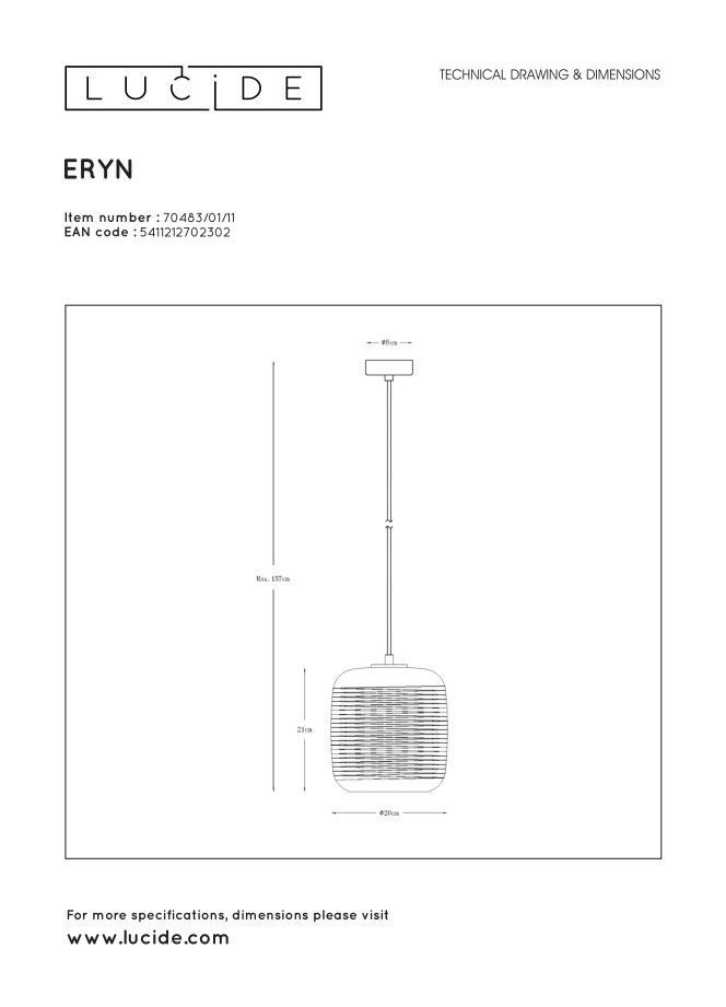 Waan jezelf in een rokerige club. De lichten gaan aan en de ster van de avond verschijnt. De schittering van Eryn heeft een hoog showbizzgehalte. Dat dankt deze hanglamp aan de uitvoering in metaal en hoogwaardig glas. Het streeppatroon op het glas geeft het licht rondom de lampenkap deels vrij. Toch is Eryn hoofdzakelijk een downlighter. Ze is een typevoorbeeld van hoe licht functionaal en architecturaal kan zijn dankzij een verrassend design. Eryn is in hoogte verstelbaar. Je kunt de handleiding van dit product hier vinden.