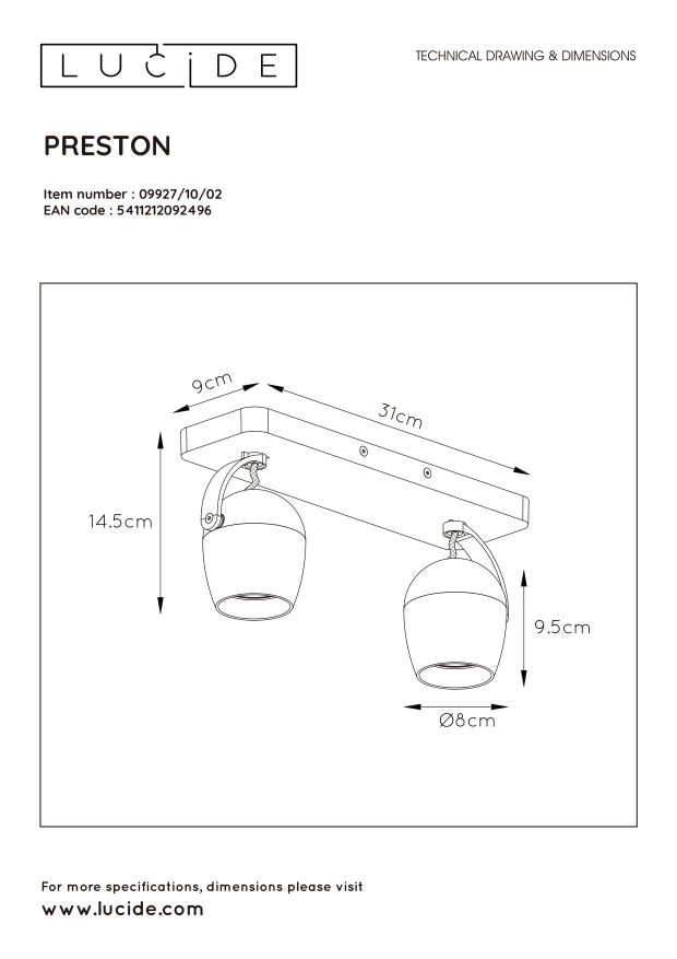 Een verfijnd retro design in een hippe, tijdloze mat gouden kleur. Dat is wat deze plafondlamp met de naam Preston zo speciaal maakt. Het hoogwaardige aluminium waaruit Preston gemaakt is, geeft de lamp nog extra uitstraling. De twee lichtbronnen van dit armatuur zijn draaibaar en kantelbaar. Zo richt je de meegeleverde en dimbare lichtbronnen meteen naar de juiste plaats. En je leest het goed: Preston is eenvoudig aan te sluiten op een dimmer en bovendien uitgerust met de dim-to-warmfunctie. Hiermee pas je de kleurtemperatuur aan van 2200K tot 3000K. Je kunt de handleiding van dit product hier vinden.