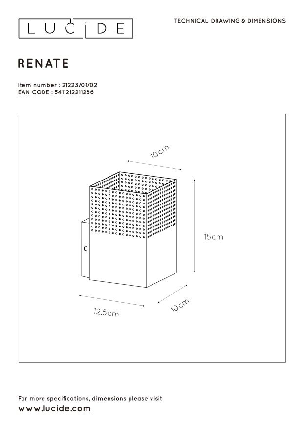 Een muur in de kijker zetten doe je met een functionele en esthetische wandlamp. Niets combineert deze eigenschappen beter dan Renate. Deze wandverlichting krijgt haar moderne vormen dankzij twee strakke, compacte kubussen in hoogwaardig metaal. Uit de bovenste kubus ontsnapt het licht via de opening en via de warmgekleurde, geperforeerde plaatjes. Door de kleine afmetingen wordt Renate in iedere ruimte verwelkomd. Je hangt deze muurlamp eenvoudig op dankzij de dunne bevestigingsplaat. Wie wil kan Renate ook makkelijk aansluiten op een dimmer. Zo brengt ze niet alleen haar elegante vormen, maar ook een hele portie sfeer in huis. Je kunt de handleiding van dit product hier vinden.