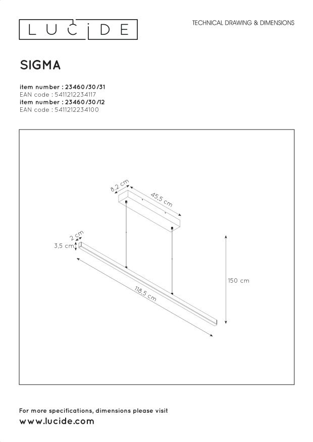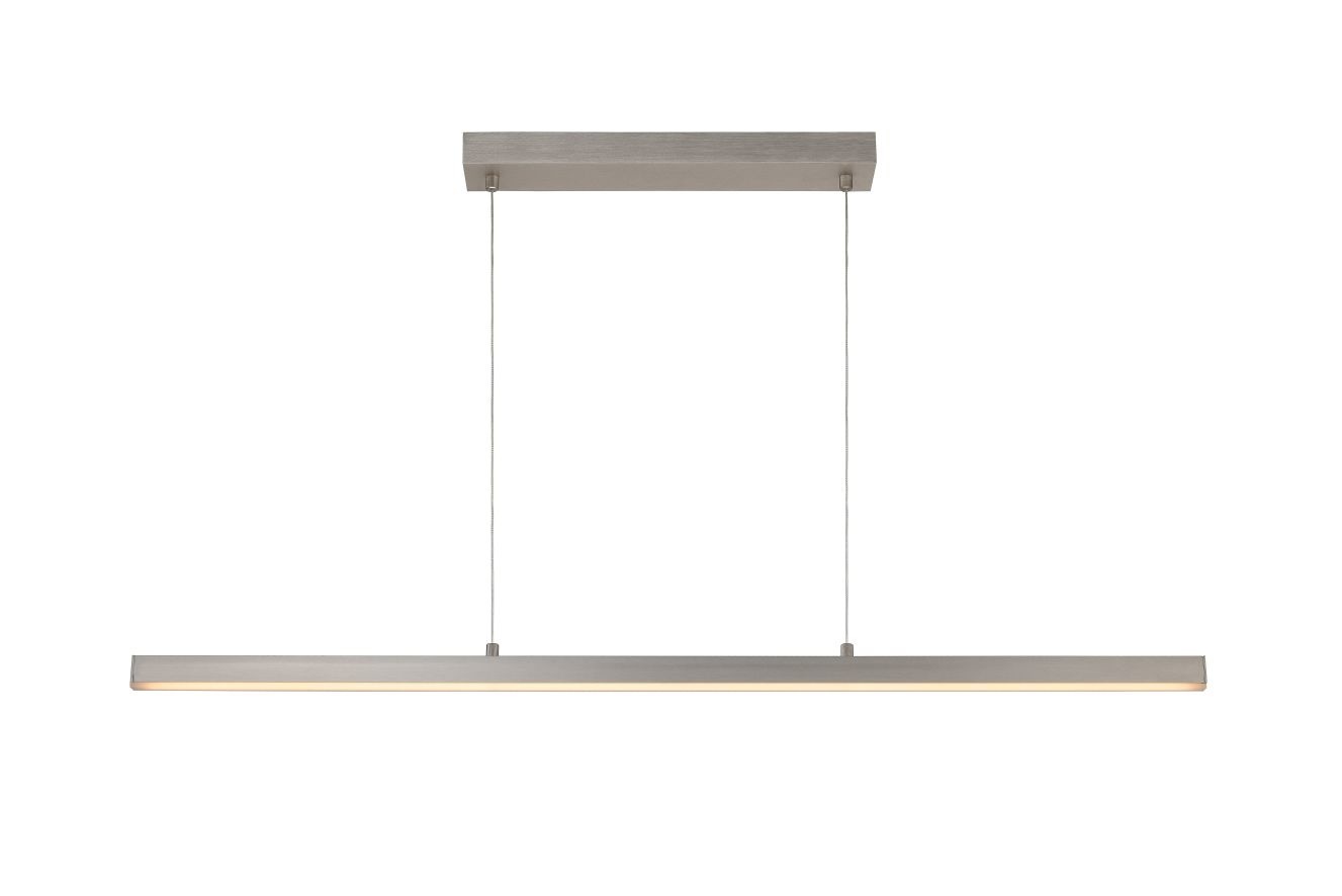 Deze pendellamp genaamd Sigma is een strakke invulling van functionele verlichting. Een metalen lichtbalk van 118,5 centimeter in mooie witte uitvoering zweeft prachtig met de hulp van twee verbindingspunten. De pendellamp is voorzien van een geïntegreerde led-verlichting met een erg helder licht. Maar liefst 3.900 lumen. In de keuken, bureauruimte of boven de eettafel hangt Sigma prachtig. Bovendien zet je met extra dimmer zelf de sfeer. Voor Sigma moet je een minimale hoogte van 20 en een maximale hoogte van 150 centimeter rekenen. Je kunt de handleiding van dit product hier vinden.